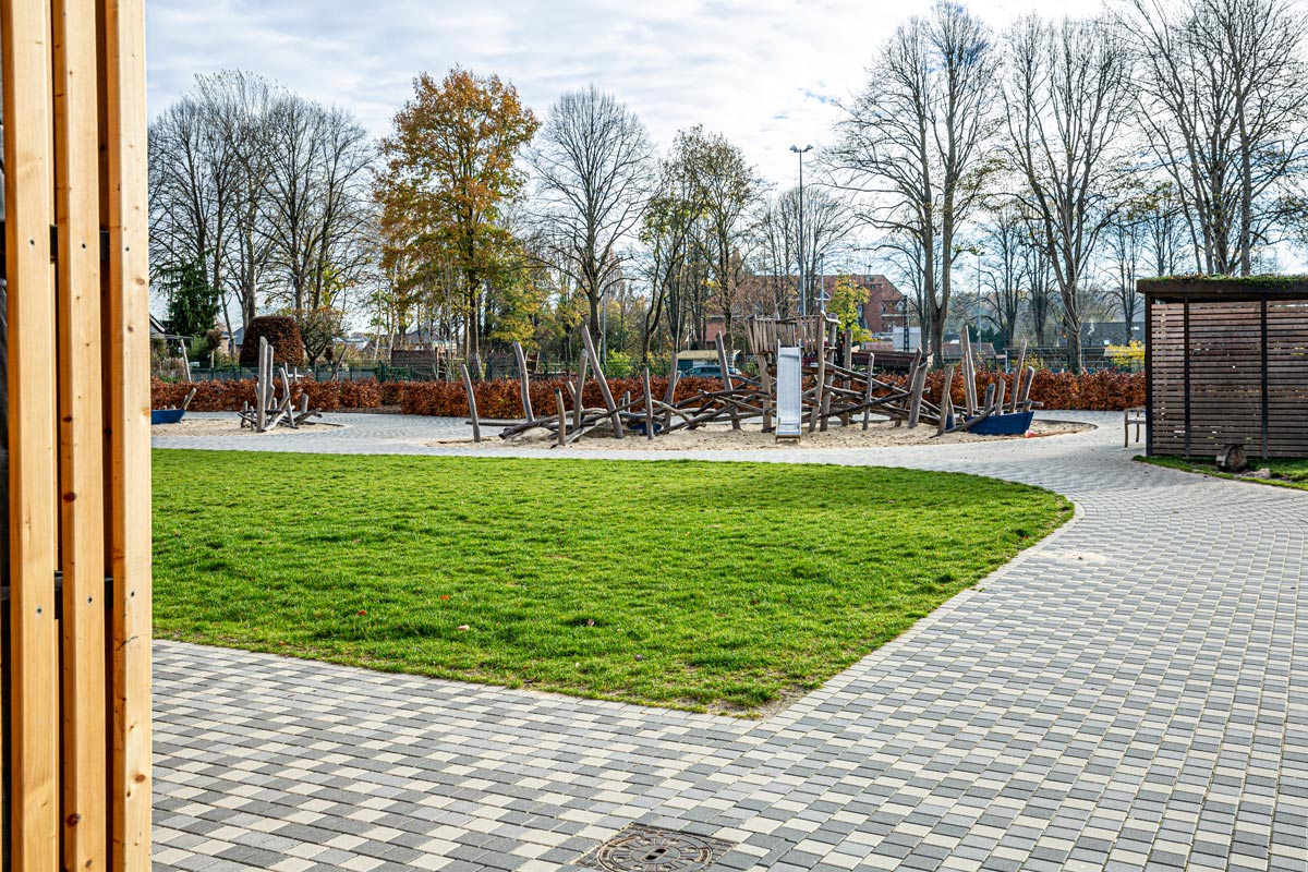 1250 m² befestigte Flächen, 300 m² Fallschutzflächen, 2600 m² Vegetationsflächen aus Rasen und Bepflanzung aus Bäumen, Hecken und Stauden, Weidetipi, diverse Spielgeräte, 2 Schuppenanlagen und sonstiger Möblierung
